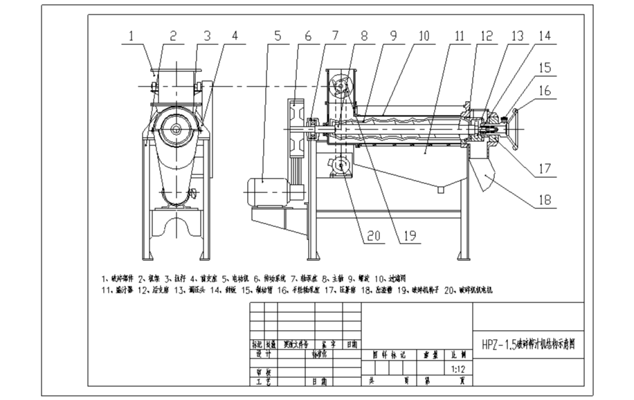 由前支座、進料斗、螺旋、過濾網、盛汁器、后支座、出渣槽等零件組成,螺旋主軸左端支承于滾動軸承座內,右端支承于手輪軸承座中,電動機通過一對三角皮帶輪驅動螺旋進行工作。