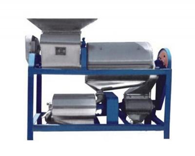 石榴榨汁機結構:該機主要由料斗、上粉碎裝置、下破碎裝置、旋轉篩、攪拌軸、螺桿泵、機架等組成。除傳動部分外,本機采用全不銹鋼制造。攪拌軸采用變頻調速。工作原理:石榴從料斗進入上粉碎裝置,上部破碎裝置按下石榴開,兩輥之間的間隙為20 mm,然后進入下粉碎裝置。下部粉碎裝置再次擠壓石榴,兩輥之間的間隙為10 mm,兩階段擠壓后的石榴籽基本與皮籽分離,并落入分離裝置。在攪拌軸的攪拌下,石榴種子從篩孔脫落,石榴皮從尾部排出,上下壓輥為彈性結構。間隙是可調的。